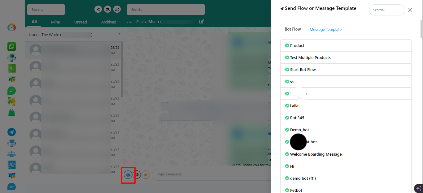 Para enviar plantillas de mensajes de WhatsApp a los suscriptores, haga clic en el ícono del robot y seleccione la plantilla deseada.
