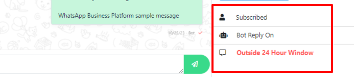 Verá información del suscriptor, incluso si el usuario se ha dado de baja, el estado de respuesta del bot y si el suscriptor está dentro o fuera de la ventana de 24 horas.